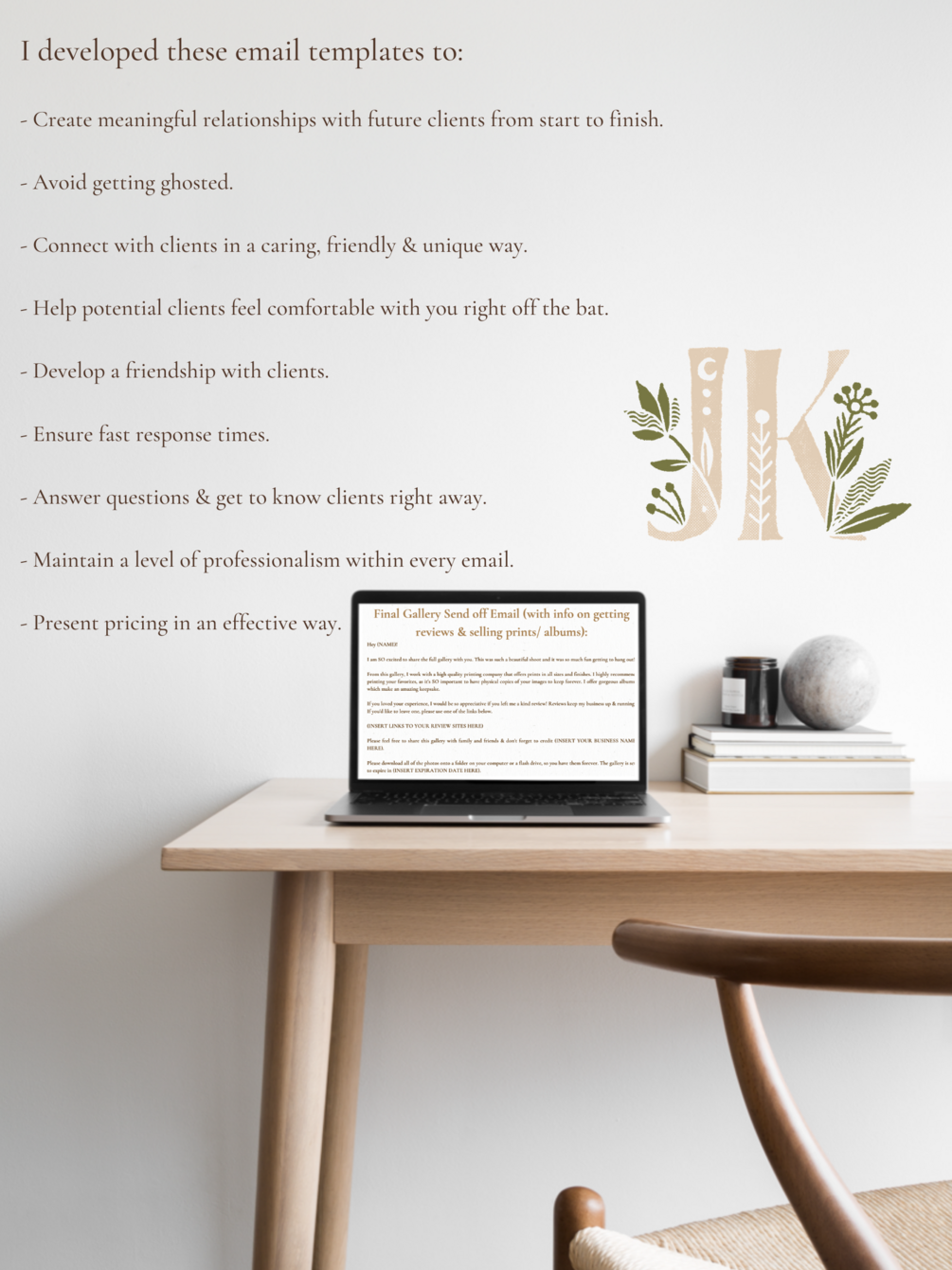 These email templates ensure amazing communication throughout the entire process, all the way from booking a shoot to sending out the final gallery. I use these emails on a daily basis and they are what I use to maintain consistent bookings, avoid ghosting, & take my client experience to a new level.