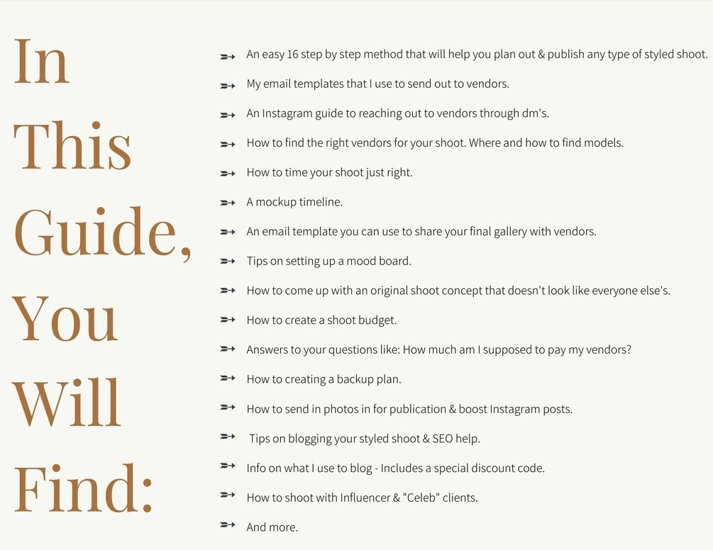- My easy 16 step by step method that will help you plan out & publish any type of styled shoot.